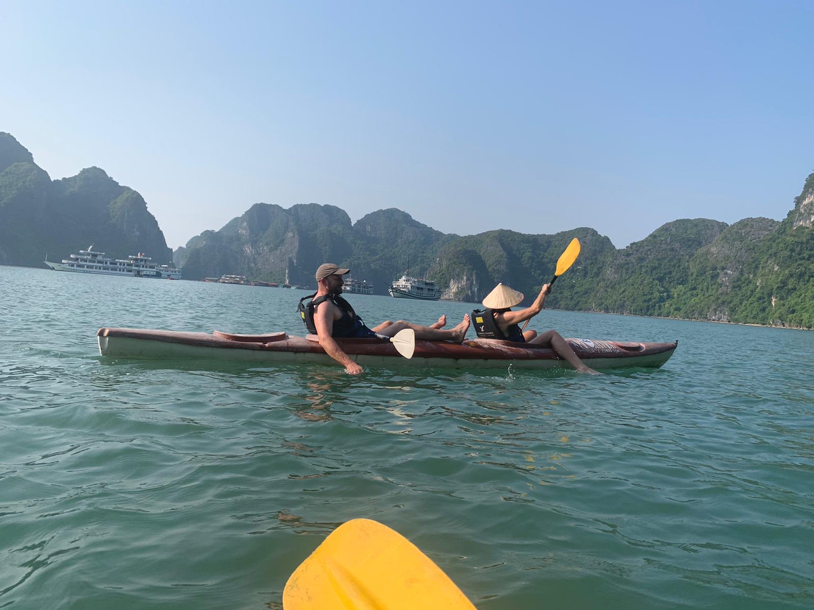 Ankunft halong Bay… wir wurden mit einem Bootchen abgeholt und auf‘s Schiff gebracht. Bis auf 2 Jungs waren wir ganz allein… Familienbootsausflug sozusagen…