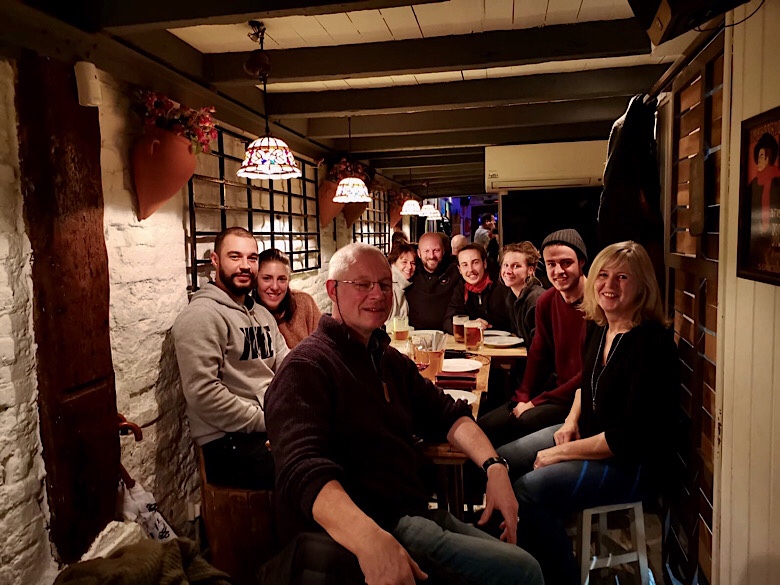 Da die Kneipe so eng war, und sie ihre Plätze mehrfach abends belegen wollen, wurden wir gebeten unsere Getränke draußen leer zu trinken… naja… wir sind ja jetzt Regen und Kälte gewohnt… gab auch einen Heizstrahler und ne Markiese…