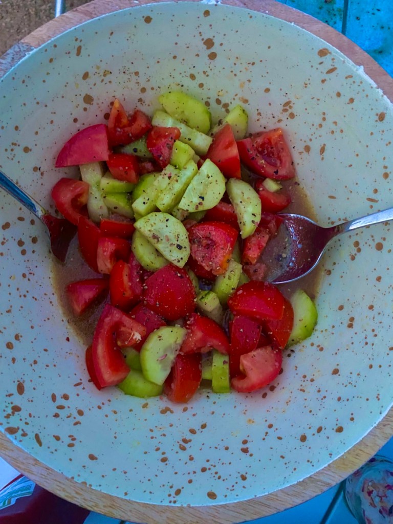 Heute ist das erste Mal kochen angesagt. Hatten die ganze Zeit vorher Brot und Wurst und Käse gefuttert. Außer als wir die letzten 2 Tage in der Pizzeria waren.