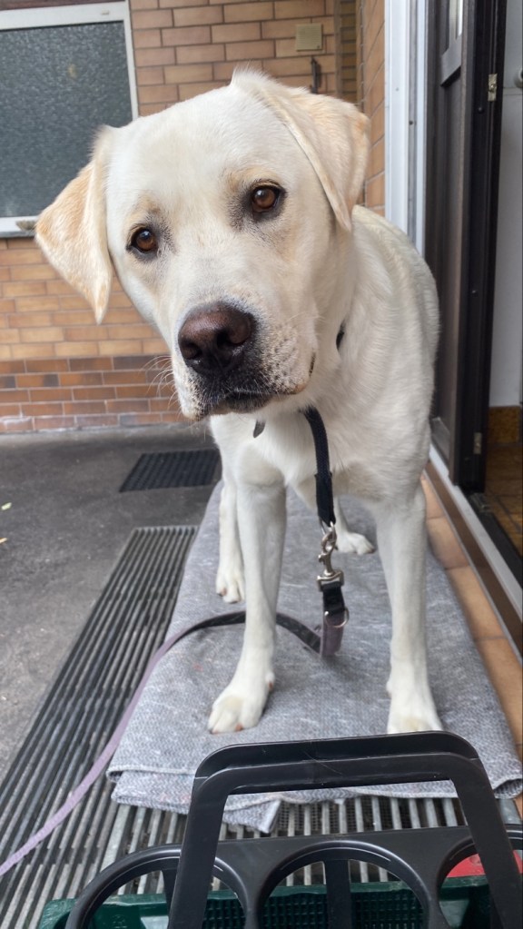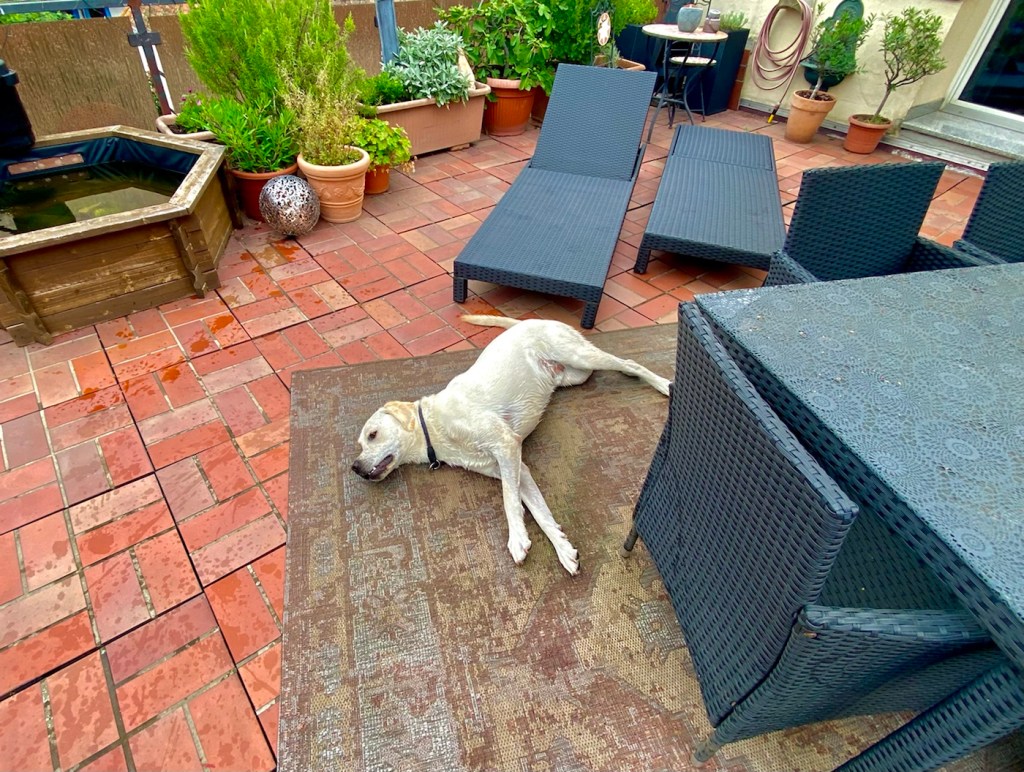 Hab ihn aber immer mal bellen gehört…. Also, in der Küche mal gestreckt und in Hof geschaut… dann liegt er einfach da. Weil er sooo nass war, hat Christian ihn unten vor der Küche im Hof an der Treppe angeleint…