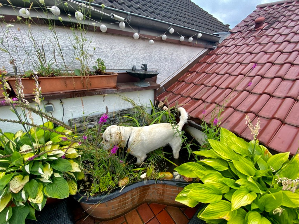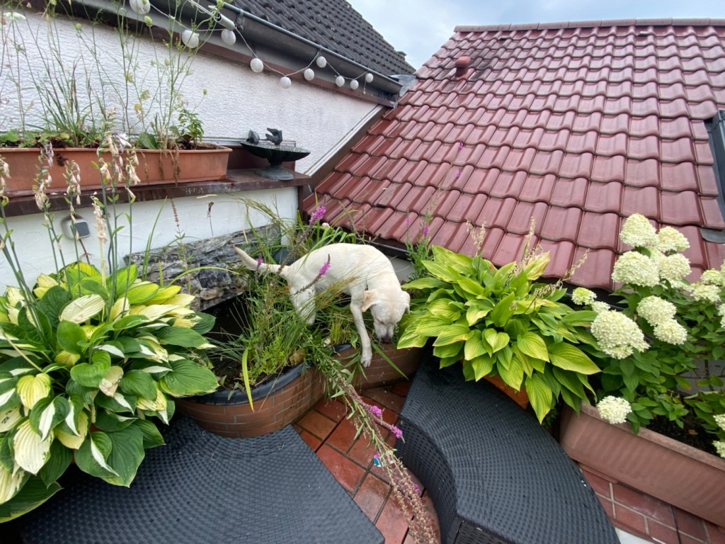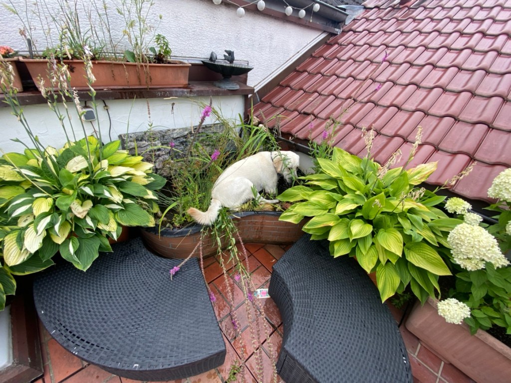 Zur Mittagspause kam er hoch auf die Terrasse…. Naja, wieder etwas aufgeregt der Gute… nachdem er den MiniEckTeich zerwühlt und zerpflückt hat, dachte ich mir – wir geh‘n lieber nochmal ne Runde!