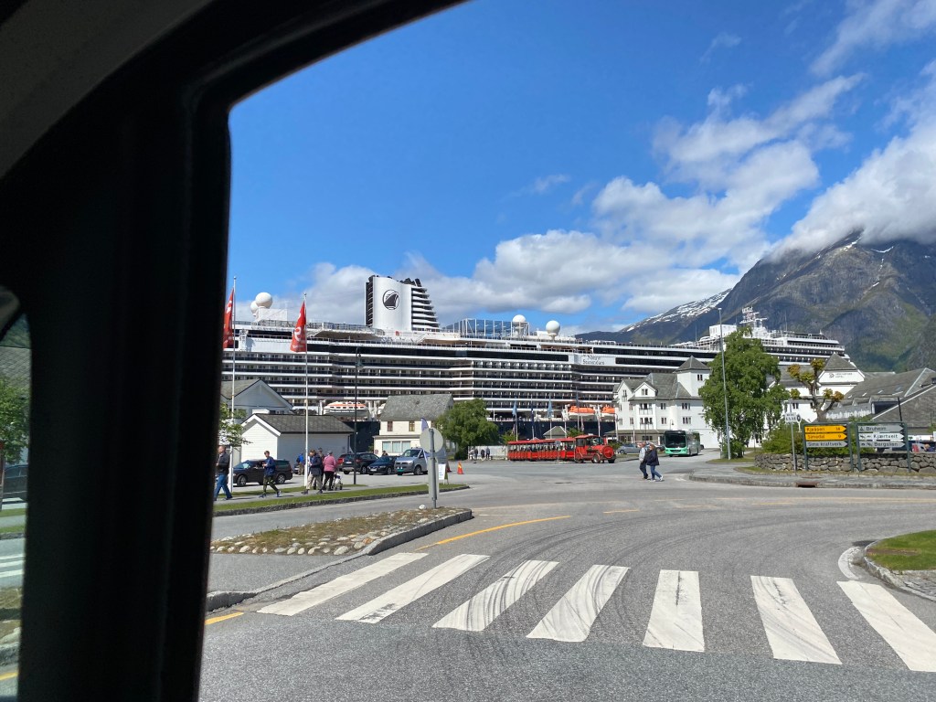 Und da fahren wir durch einen Ort und vor uns plötzlich der Riesen Kreuzfahrtdampfer… gleich hinterm Kreisverkehr… völlig verrückt.