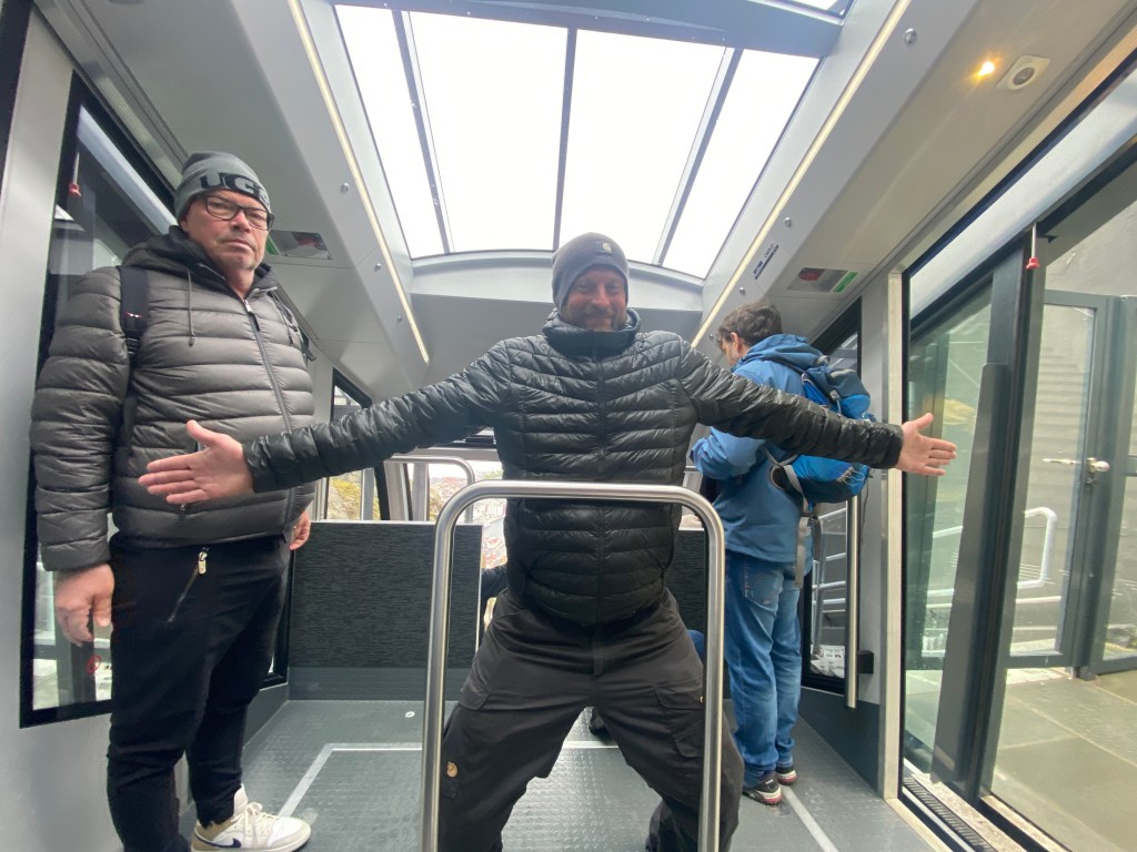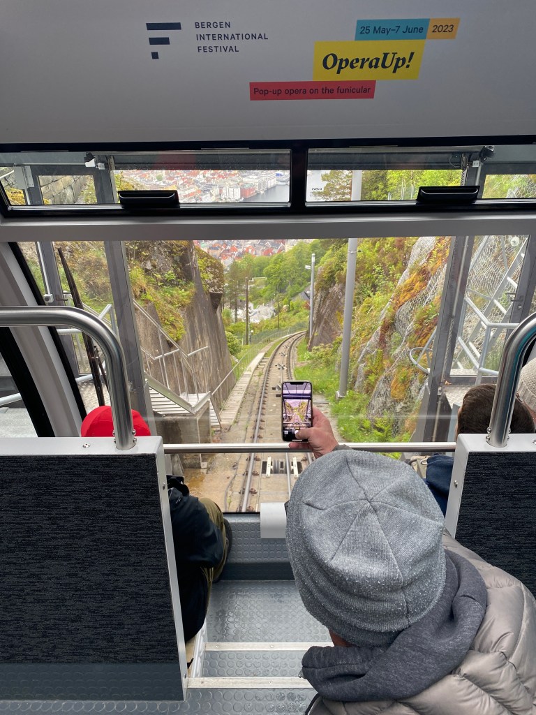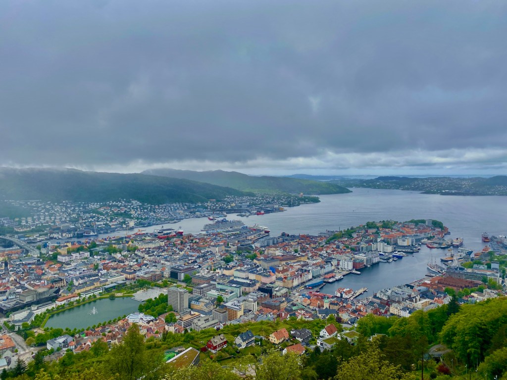 Dann sind wir mit der Fløibane auf den 320 Meter hohen Fløyen gefahren. Das ist eine Standseilbahn in Bergen. Und obwohl das Wetter sehr bescheiden war, war der Ausblick atemberaubend.