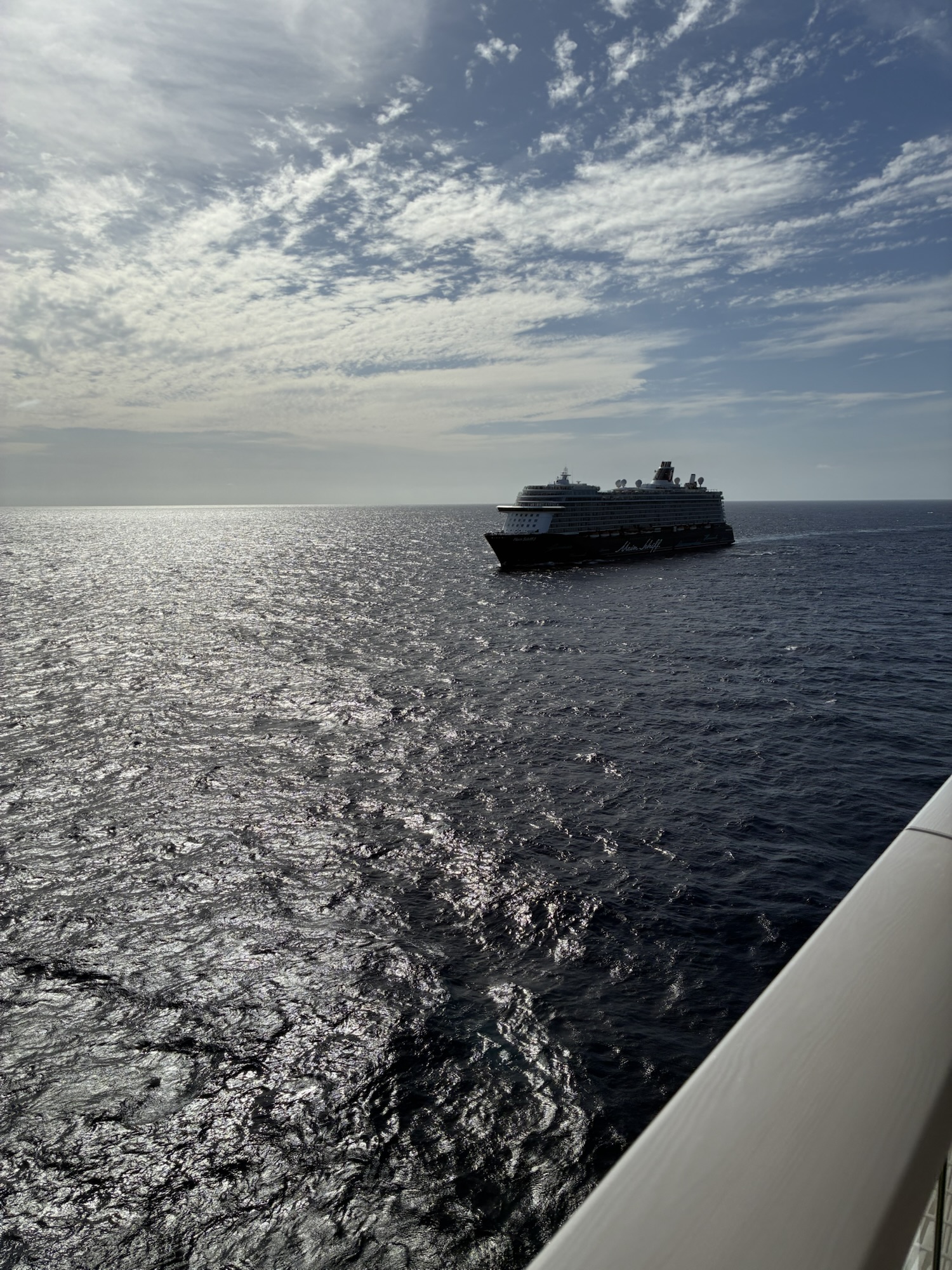 Gegen 15:00 sind wir auf Deck um ne Kleinigkeit zu essen und haben uns dann auf so ner Couch in der Sonne niedergelassen. Das war super schön. Viele waren schon weg vom Pool um zu duschen (glaub ich)
