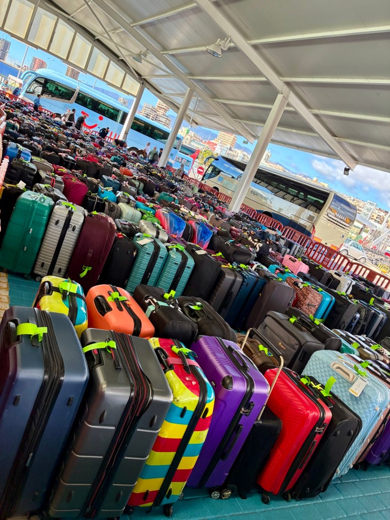 Heute sind ca. die Hälfte aller Gäste abgereist und ebenso viele wieder angereist. Vorne am Hafen war ein riesiges Koffermeer von den Gästen die nachhause fahren.